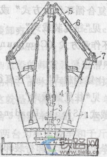 1-起重柱; 2-吊桿座; 3-吊貨桿;4-下吊貨滑車;5-吊貨索;6-千斤索; 7-回轉(zhuǎn)頭部