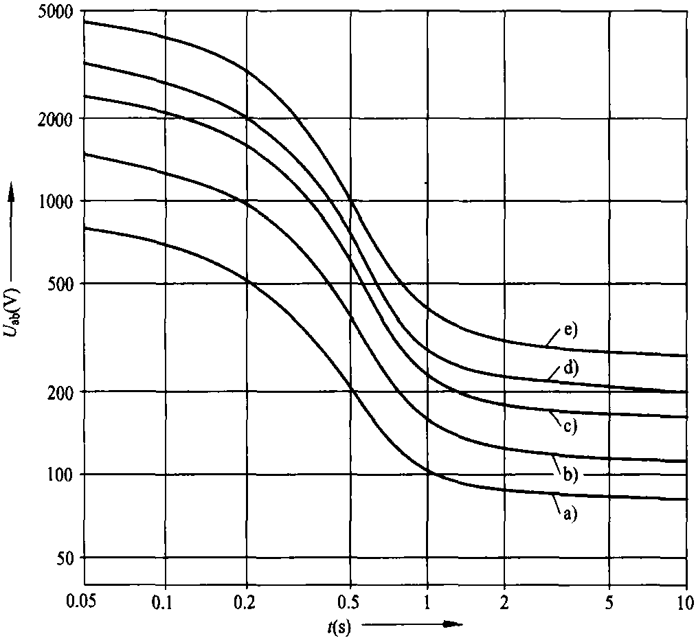 例如: 在鐵路上工作的人,Ra是Ra1(如鞋的電阻) 和當(dāng)?shù)氐慕拥仉娮鑂a2的總和。因為通常將鞋和鐵路附近的接地電阻假設(shè)為電流持續(xù)時間的函數(shù),因此圖12.4所示的是在考慮了接觸回路中的附加電阻之后所允許的接觸電壓。這些值明顯大于未采取任何保護(hù)措施的人體所能承受的允許接觸電壓。
