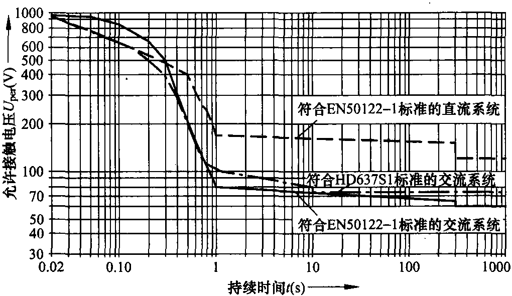 圖12.2 根據(jù)EN 50122-1和HD 637 S1標(biāo)準(zhǔn),允許接觸電壓Uper與電流持續(xù)時間t的關(guān)系曲線。