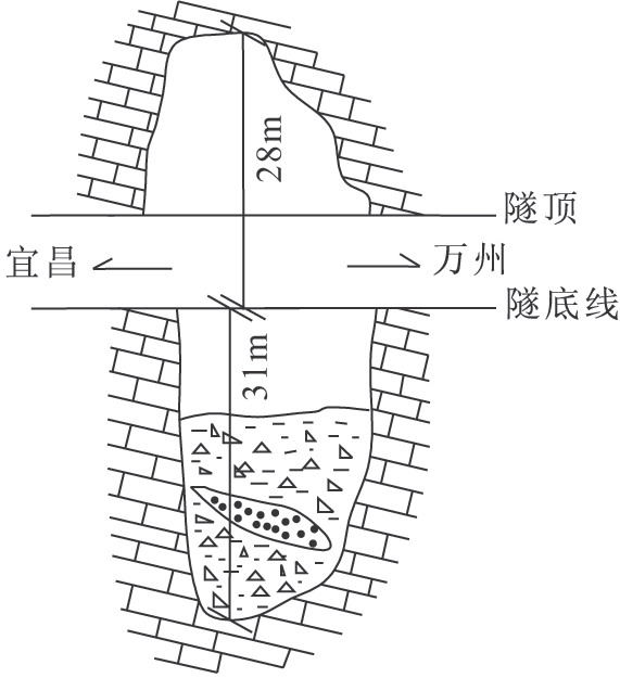 (3)上述兩洞穴溶腔應(yīng)是近代紙廠灣暗河、耗子洞暗河被棄置的管道腔體。由于地殼間歇性不斷上升,排泄基準(zhǔn)面不斷深切,管道流(暗河)隨之不斷下切并不斷保留被棄置的腔體及其原有堆積物(部分夾雜崩塌堆積物),即現(xiàn)時(shí)隧道遭遇的腔體及其堆積物。由于近代暗河下切及其保留的棄置腔體存在延續(xù)性,故棄置的腔體與近代暗河之間存在聯(lián)系、溝通。
