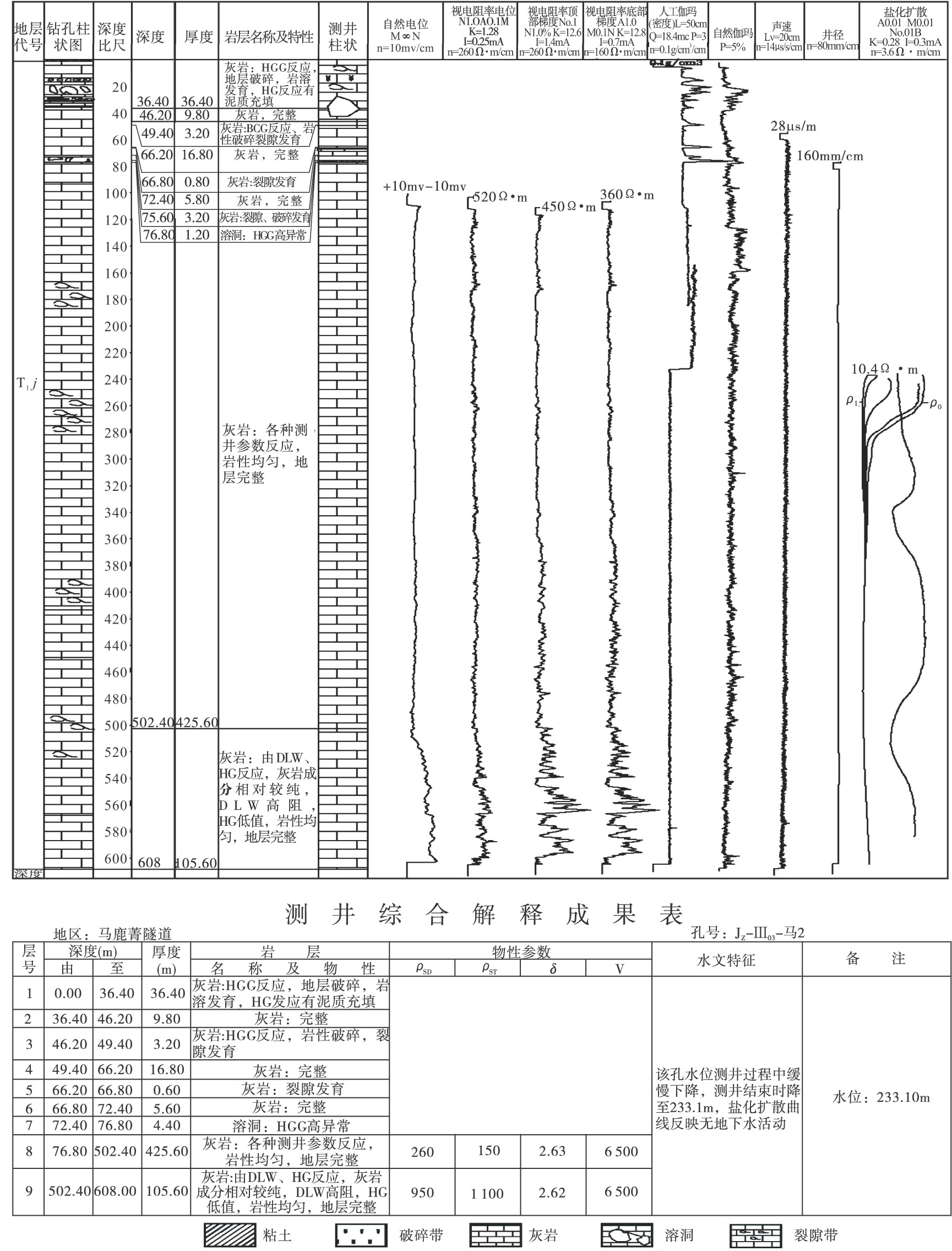 圖3-84馬鹿箐隧道JZ-Ⅲ03-馬2孔測(cè)井曲線綜合解釋成果圖