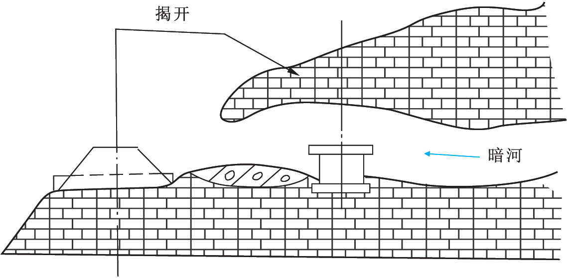 (2)線路標(biāo)高接近于暗河標(biāo)高時(shí),應(yīng)將線路選定在暗河出口下游穩(wěn)定地層通過。當(dāng)受條件限制時(shí),最好揭開暗河,以橋或涵代替路基通過(圖4-4)。