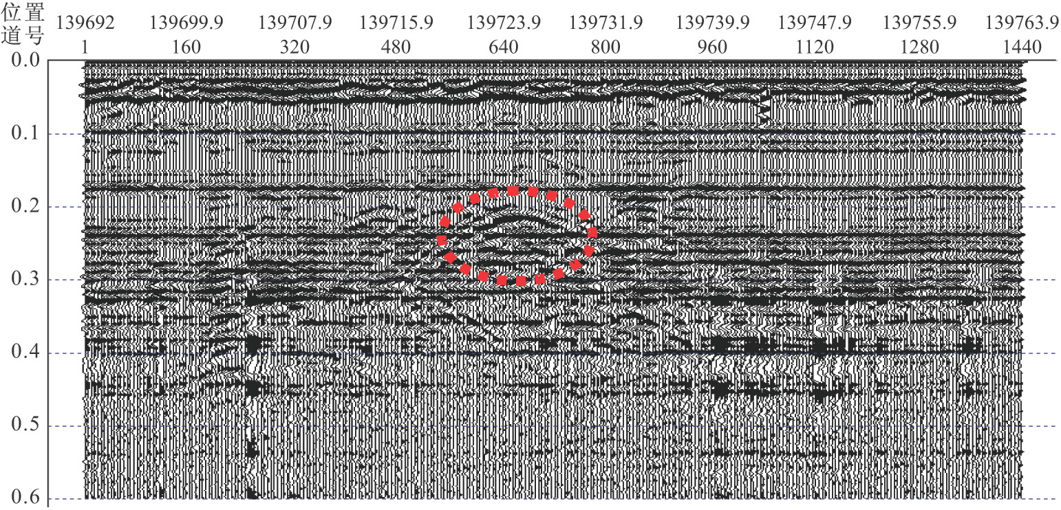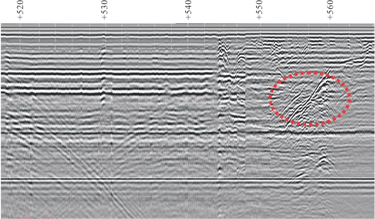 從雷達(dá)圖像分析看出,溶洞雷達(dá)圖像特點(diǎn)是被溶洞側(cè)壁、頂板的強(qiáng)反射所包圍的弱反射空間,溶洞底界面的反射則不太明顯,當(dāng)溶洞為空洞(或充水)時,洞體內(nèi)雷達(dá)波幾乎是沒有反射的直達(dá)溶洞的底界面;當(dāng)溶洞充填沉積物時,其溶洞內(nèi)的充填物根據(jù)物性差異的不同,也會產(chǎn)生不同的雷達(dá)波形式,大多數(shù)情況下其充填物為塊石夾粘土等不均勻體時,也會導(dǎo)致穿過其中的雷達(dá)波形雜亂無章,若粘土或細(xì)密型碎顆粒狀物含量較大,也可見一組較短周期的細(xì)密的弱反射,甚或?qū)е吕走_(dá)波損失殆盡,這也是判定充填型空洞存在的主要標(biāo)志之一。