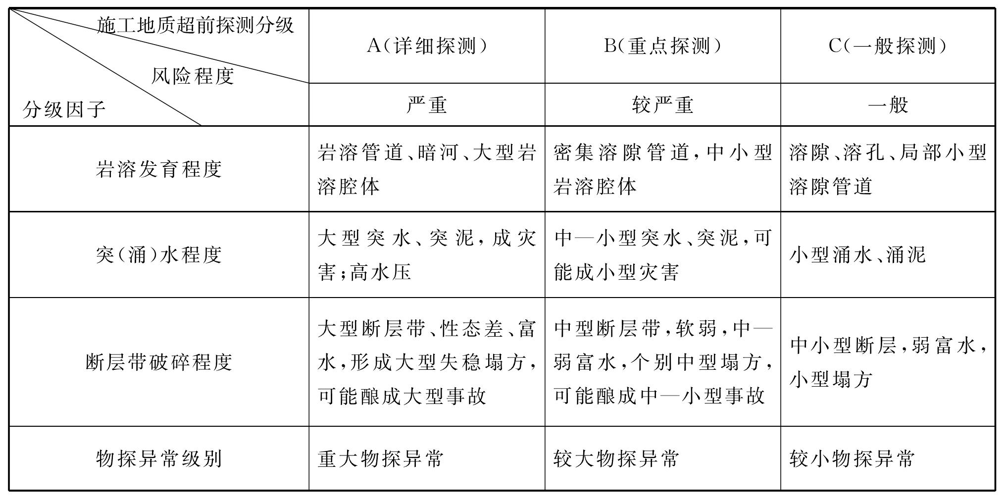 根據(jù)巖溶發(fā)育程度、突水突泥危害程度、斷層帶穩(wěn)定程度、物探異常級(jí)別,將巖溶隧道施工地質(zhì)超前探測(cè)分為A、B、C三個(gè)等級(jí)(表6-5):