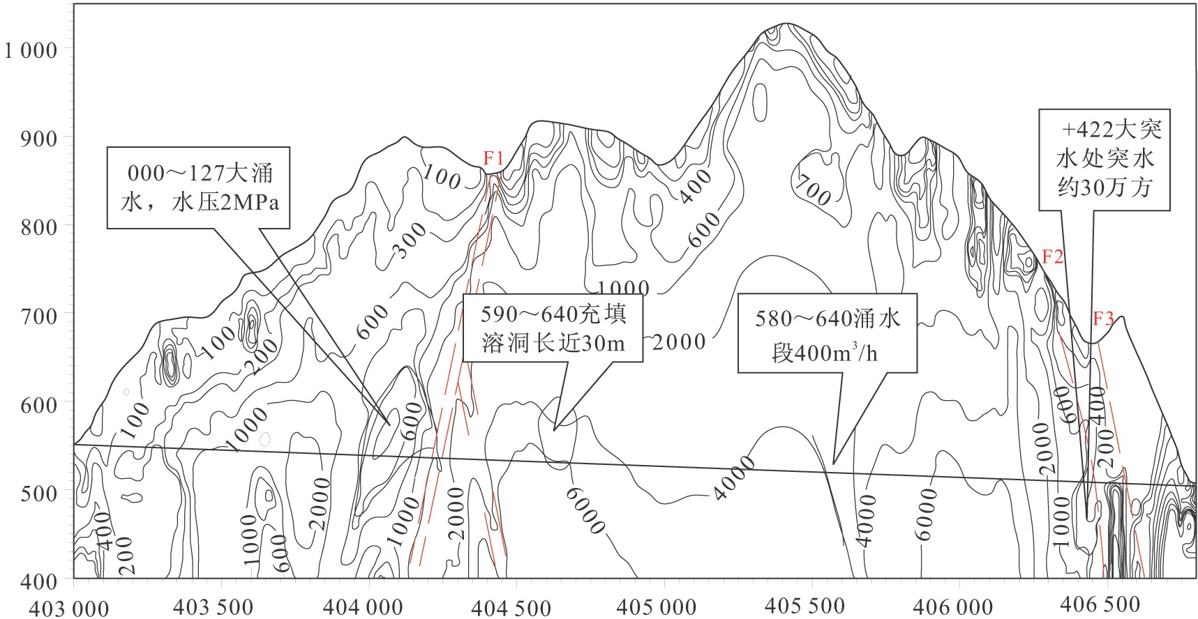 依據(jù)控制巖溶發(fā)育的地層巖性、地質(zhì)構(gòu)造、巖溶水的交替循環(huán)條件綜合確定巖溶隧道不同地段的巖溶發(fā)育程度。如:可溶巖與非可溶巖接觸部位、斷層帶附近有利于巖溶發(fā)育;褶皺核部有節(jié)理裂隙集中、密集發(fā)育,為巖溶水提供強(qiáng)滲流通道,且易溶蝕成槽谷、洼地,有利于地表水的匯集、滲漏,為巖溶及巖溶水的發(fā)育提供了場(chǎng)所和條件。隧道工程在通過巖溶發(fā)育地區(qū)時(shí),易遭遇巖溶腔體、管道、暗河,誘發(fā)突(涌)水地質(zhì)災(zāi)害。