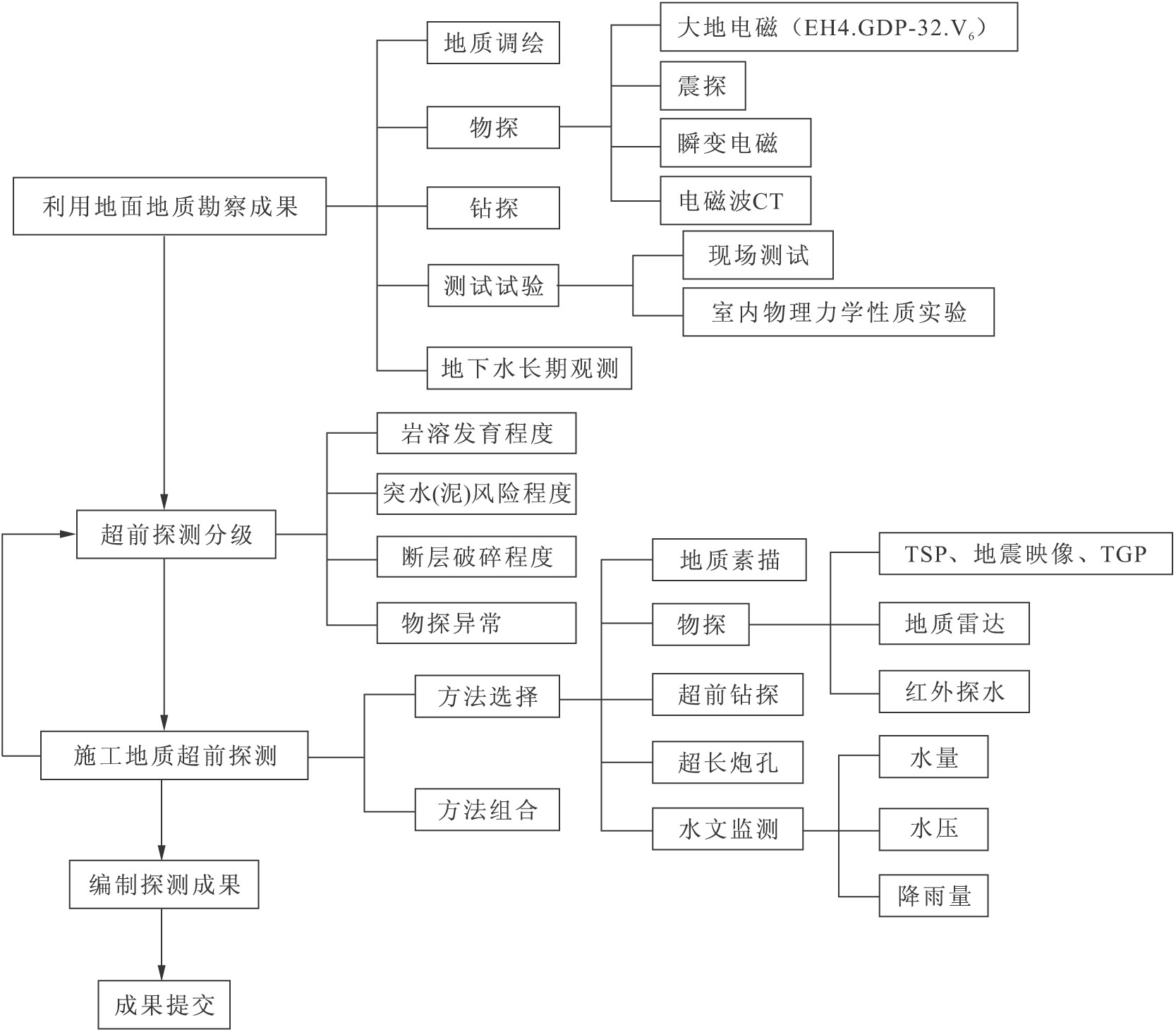 第二,按不同分級的施工地質(zhì)超前探測組合模式,合理選擇超前探測方法進行施工地質(zhì)超前探測,并根據(jù)超前探測成果動態(tài)調(diào)整分級。
