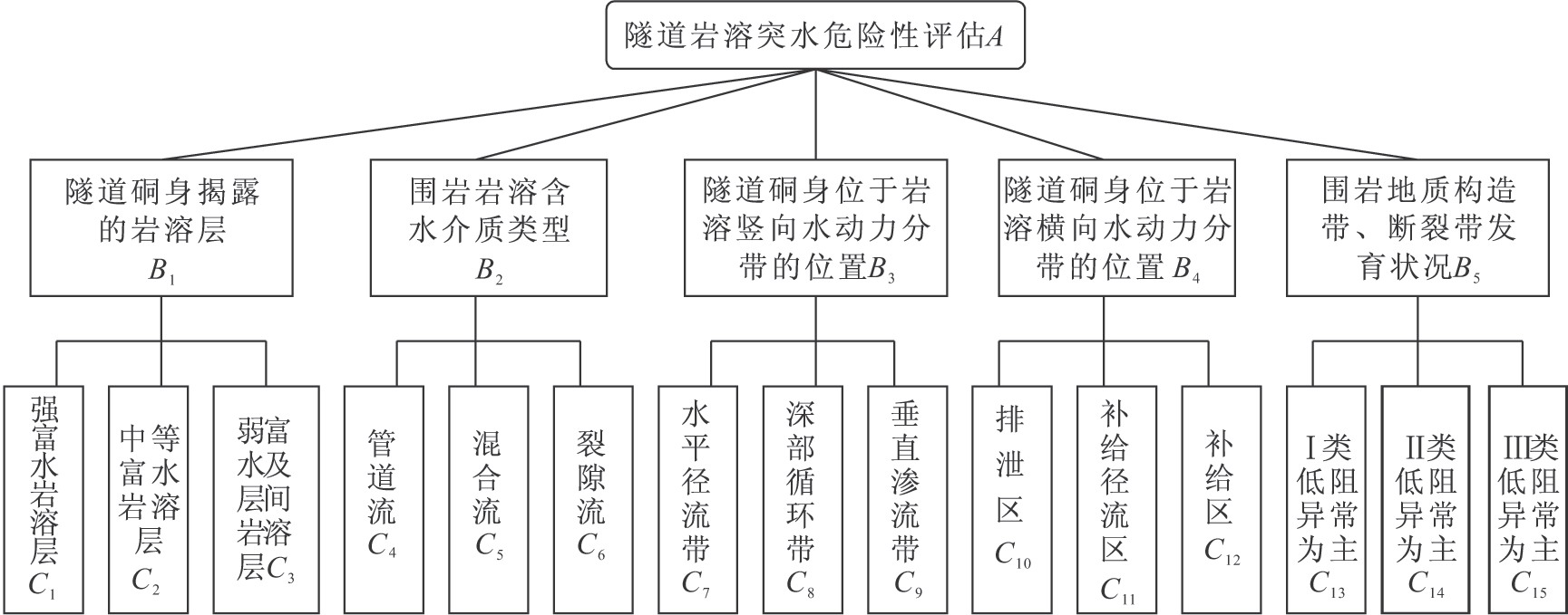 層次分析法是按照一定的規(guī)律把決策過程層次化、數(shù)量化,是一種對多方案或多目標(biāo)進(jìn)行決策的方法。用層次分析法作隧道巖溶突水危險系統(tǒng)分析,首先要把問題層次化。根據(jù)突水要素的性質(zhì)和要達(dá)到防范突水危險發(fā)生的總目標(biāo),將問題分解為不同的組成因素,并按照因素間的相互關(guān)聯(lián)影響以及隸屬關(guān)系將因素按不同層次聚集組合,形成一個多層次的分析結(jié)構(gòu)模型,并最終把系統(tǒng)分析歸結(jié)為最低層次(供決策的方案、措施等),這相對于最高層次(總目標(biāo))的相對重要性權(quán)值的確定或相對優(yōu)劣次序的排序問題。決策者根據(jù)對系統(tǒng)的這種數(shù)量分析進(jìn)行決策,并找到解決問題的方法。