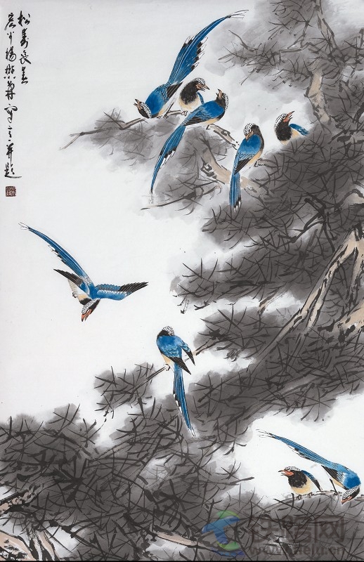 1992年楊懋森應(yīng)邀創(chuàng)作的 《春光爛漫圖》在天安門城樓上亮展;1985年創(chuàng)作的 《雙壽圖》參加中國美協(xié)、中國書協(xié)聯(lián)展獲二等獎;2006年應(yīng)邀在韓國首爾舉辦了楊懋森中國花鳥畫個人展;由孫其峰題款的 《楊懋森花鳥作品集》一經(jīng)出版發(fā)行便好評如潮;2013年其以髦耋之年創(chuàng)作的橫3.5米、縱1.45米的巨幅力作 《百鳥朝鳳圖》更是令人拍案叫絕。畫面里工中有寫,寫中有工,讓觀者感受到百鳥舞天地的大美生命氣象。