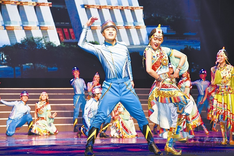 7月6日19點(diǎn)整,垂在舞臺(tái)上的紅幕徐徐拉開(kāi),廣袤的高原、冷峻的雪山、飛馳的列車(chē)……伴隨著LED顯示屏上不斷閃現(xiàn)的青藏高原絕美風(fēng)景,演員們用靈動(dòng)的肢體語(yǔ)言,為觀眾勾勒出一幅洋溢濃郁高原民族特色的畫(huà)面。