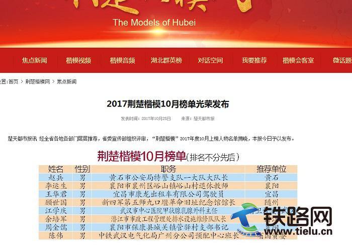 10月25日,經(jīng)湖北省各地各部門層層推薦,湖北省委宣傳部組織評(píng)審,“荊楚楷!2017年度10月上榜人物名單揭曉。其中,經(jīng)湖北省國資委推薦,中國中鐵武漢電氣化局集團(tuán)廣州分公司東海島項(xiàng)目部預(yù)配中心班長陳偉位于8人上榜人物之列。
