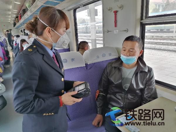 師傅,您要補(bǔ)票嗎?現(xiàn)在還有臥鋪票,到終點(diǎn)站,還要一天一夜呢?師傅,您把口罩戴好,現(xiàn)在是疫情期間,要做好防護(hù)!趙建坤一邊熟練的為旅客補(bǔ)票,一邊為旅客做著防護(hù)宣傳。面對(duì)與日俱增的旅客,列車(chē)上補(bǔ)票的旅客越來(lái)越多,趙建坤在辦公車(chē)補(bǔ)票,一坐就是一兩個(gè)小時(shí),有空她又下車(chē)廂為旅客補(bǔ)票,一天下來(lái),嗓子都變得有些沙啞,有時(shí)吃飯的時(shí)間也錯(cuò)過(guò)了,她就吃一點(diǎn)自帶的零食,她沒(méi)有叫苦沒(méi)有抱怨。在她的臉上你始終都看不到絲毫疲倦,工作中的她依舊保持著微笑和最佳的精神面貌。