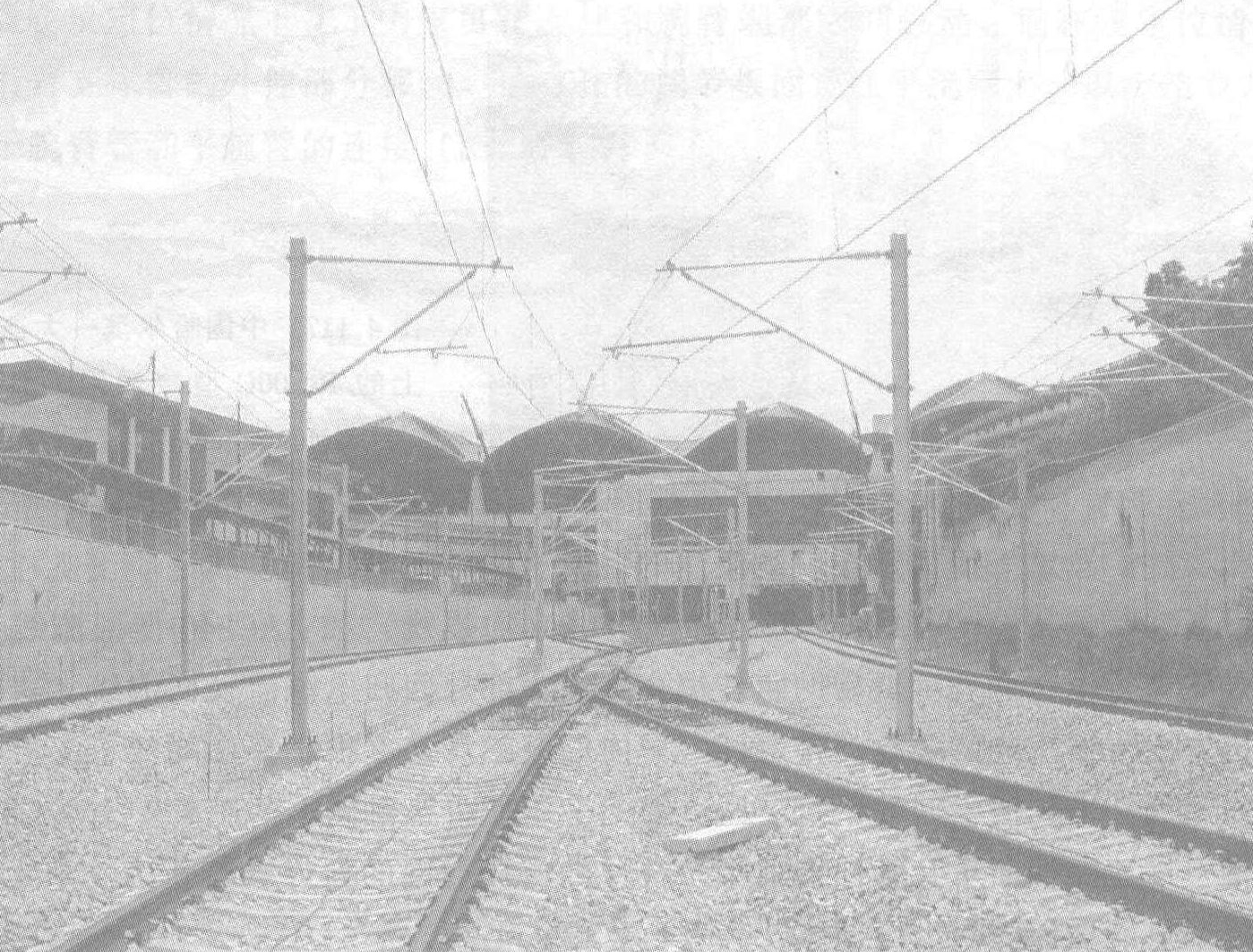 為了將吉隆坡市區(qū)與新建的機(jī)場用鐵路連接起來,Express Rail Link Sendirian Berhad(ERL SB) 公司于2001年修建了一條新鐵路線。線路長25km,從兩個(gè)方向每小時(shí)有9趟列車通過,速度為160km/h。該線路采用西門子公司的SICAT S1.0型架空接觸網(wǎng)設(shè)計(jì)。在這種結(jié)構(gòu)中采用鋁合金腕臂懸掛接觸線和承力索,接觸線和承力索張力通常為24kN,支柱為單 “H” 形支柱 (圖4.119)。65m的跨距可根據(jù)氣候條件進(jìn)行調(diào)節(jié)。采用1:3傳動(dòng)比的補(bǔ)償裝置來保持張力恒定。在吉隆坡主車站內(nèi)安裝了一條不易斷裂的架空接觸軌 (圖2.19),這樣就避免了采用高成本的接地措施。