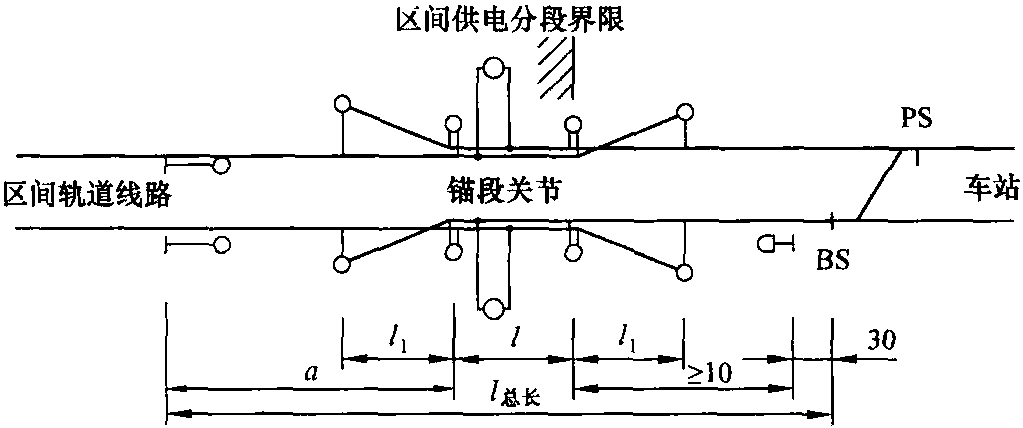 第10.5節(jié)中描述的車站與區(qū)間供電分段要求接觸網(wǎng)系統(tǒng)的線路有電氣分界。此處設(shè)計(jì)的絕緣錨段關(guān)節(jié)需要信號(hào)保護(hù),即: 升起受電弓的牽引車輛在預(yù)告停止的信號(hào)機(jī)前后?繒r(shí),不應(yīng)該停在進(jìn)站信號(hào)機(jī)與進(jìn)站道岔間的絕緣錨段關(guān)節(jié)跨距內(nèi)。圖6.17中的距離a界定了錨段關(guān)節(jié)轉(zhuǎn)換跨距相對(duì)于信號(hào)機(jī)的位置并表現(xiàn)為信號(hào)機(jī)與跨距內(nèi)第一個(gè)轉(zhuǎn)換柱之間的距離。