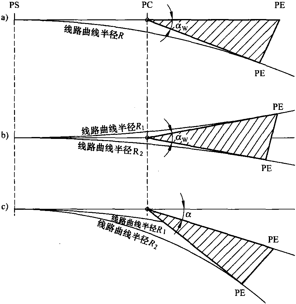 曲線道岔提供了曲線上的軌道轉(zhuǎn)換操作。它們由圖6.21中所示的圍繞道岔中心點的道岔三角轉(zhuǎn)動角度α(保持切線長度t和道岔角度αw) 組成。在旋轉(zhuǎn)操作后,如果線路曲線半徑分別為R1和R2的正線或側(cè)線的曲線中心位于道岔對面的兩側(cè),那么指的是圖6.21b) 中的逆向雙開道岔,而同向雙開道岔的曲線中心位于道岔的同一側(cè),見圖6.21c)。