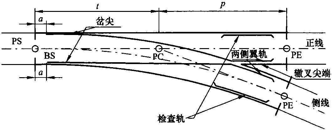 道岔一詞在這里指的是道岔,交叉渡線和雙開道岔等。[6.7] 還指出了正線道岔和側(cè)線道岔的不同。正線道岔指的是單開道岔上的直線線路是正線; 在曲線道岔上,它指的是相關(guān)基本形式的直線線路或高運營級別線路和重載線路。