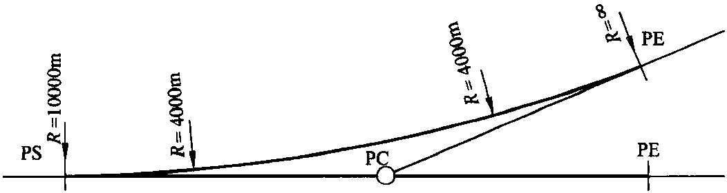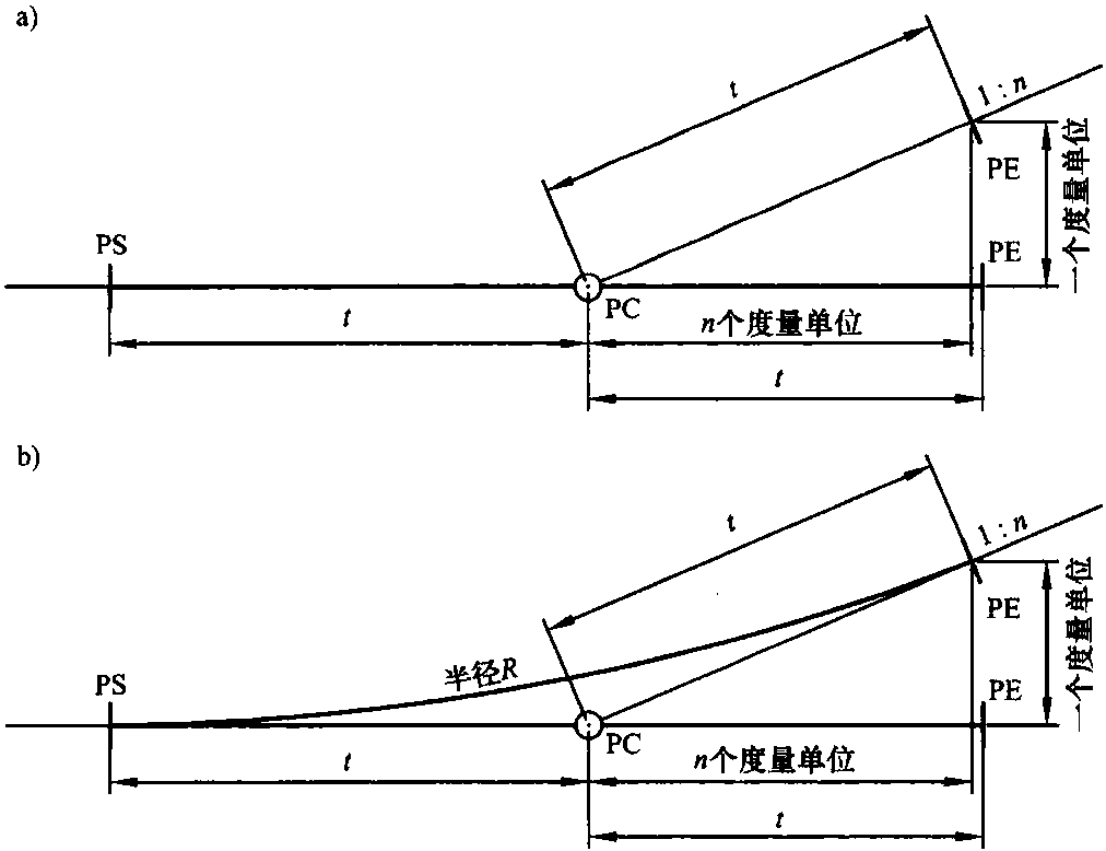 在圖6.18中,縮寫PS指的是道岔始點,PC指的是道岔中心,PE指的是道岔終點。如在道岔始點處以側(cè)線作半徑畫圓,那么側(cè)線上的道岔終點則位于該圓切線為1:n的地方。道岔中心就在如圖6.19所示的側(cè)線中心線切線與正線中心線相交的地方。由于幾何原因,道岔始點PS與岔尖BS是不在一處的。