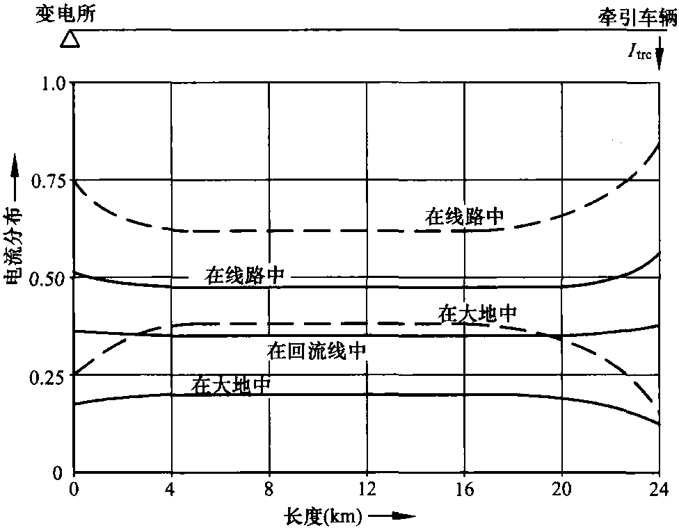 圖12.32 在單位長(zhǎng)度有效電導(dǎo)為2S/km的雙線鐵路系統(tǒng)中,回流牽引電流在各回流路徑中的分布