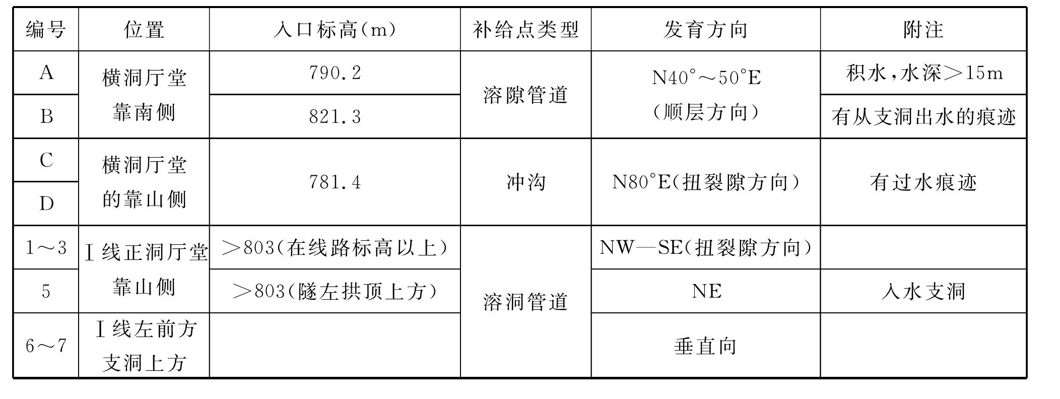 1)據(jù)現(xiàn)場調(diào)查, 溶腔內(nèi)主要補給(入水)點及溶腔水文地質特征如表2-8所示。
