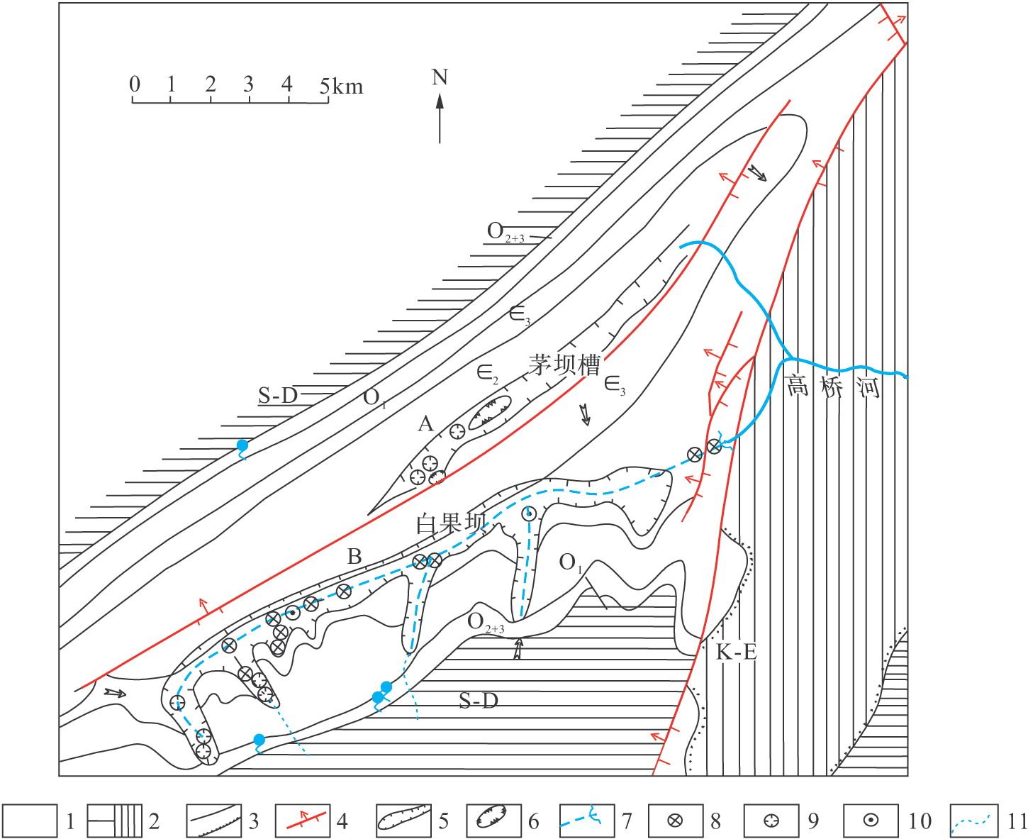 7.暗河管道及出口;8.落水洞;9.水平溶洞;10.暗河天窗;11.季節(jié)性地表溪流