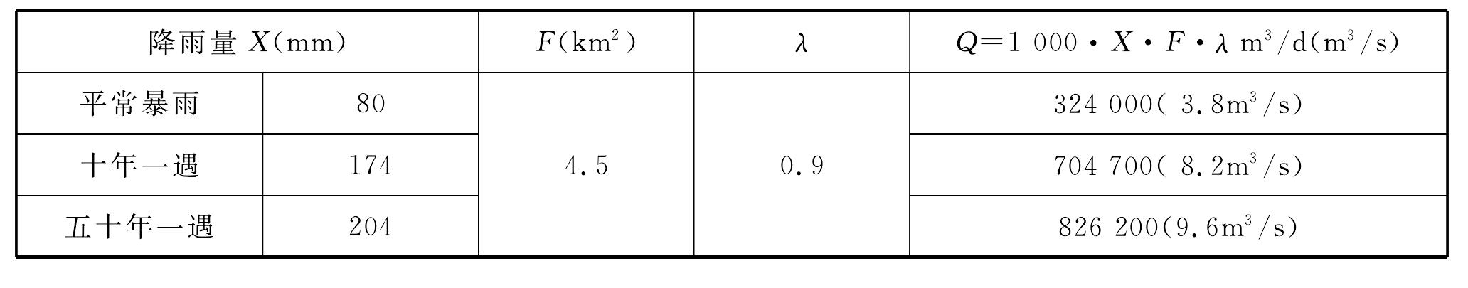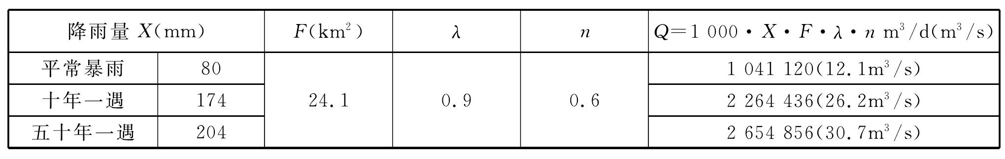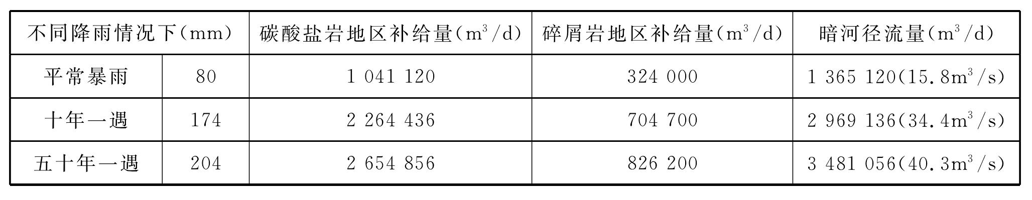 暗河總匯水面積28.6km2,其中碳酸鹽巖地區(qū)面積24.1km2、碎屑巖地區(qū)面積4.5km2;因暗河全程為伏流(入長巴河的排泄口亦被埋伏),缺乏流量觀測資料,只有通過預(yù)測評估其流量,估測暗河暴雨期流量如表2-12、表2-13、表2-14所示。