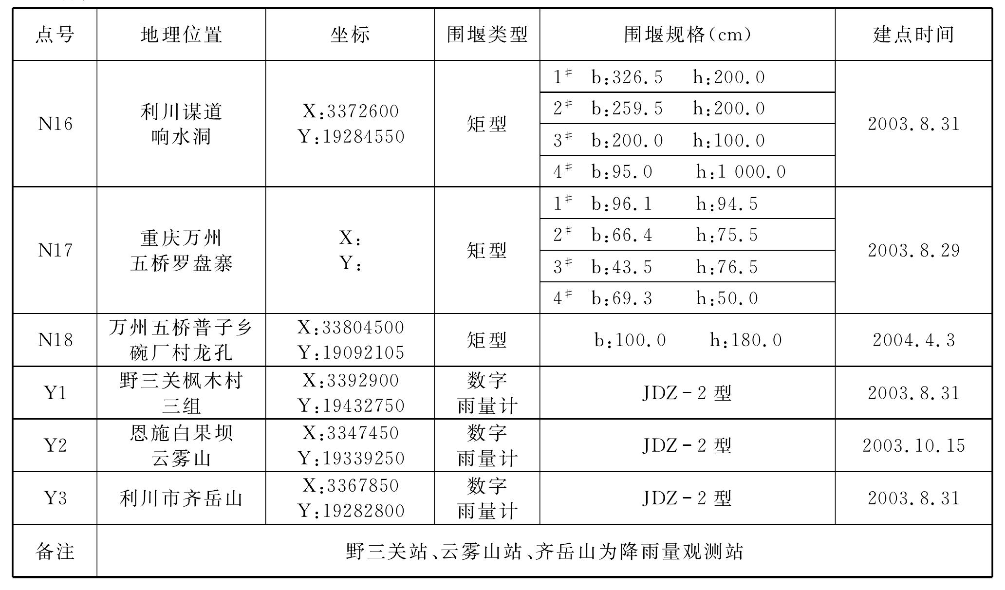 氣象點選用重慶市水文儀器廠生產(chǎn)的JDZ-1型數(shù)字雨量計自動觀測儀器。各點的具體位置及修建情況如表3-11所示。