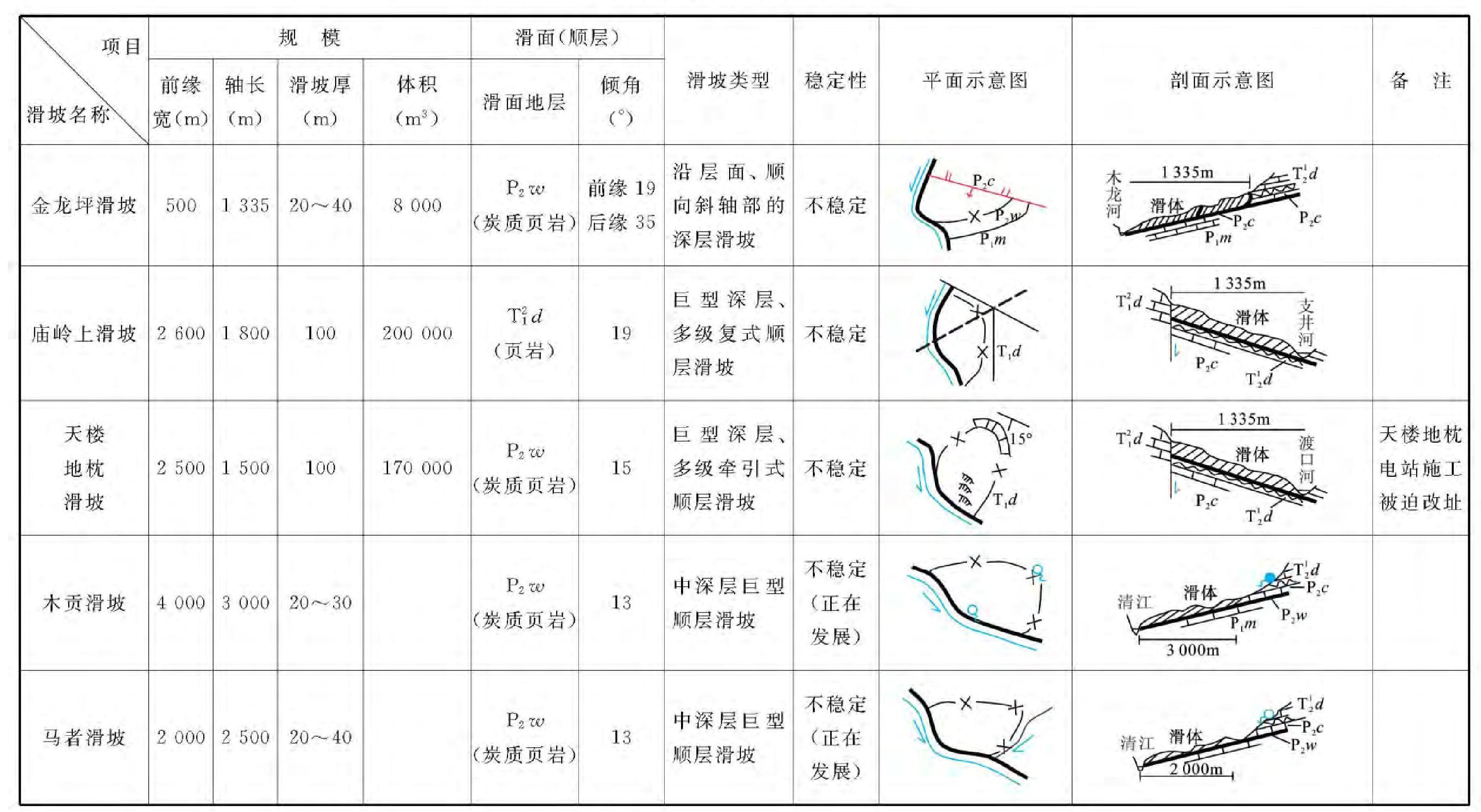 控制線路方案選擇的大型滑坡較多,具代表性的金龍坪滑坡、廟嶺上滑坡、天樓地枕滑坡、馬者滑坡、木貢滑坡、堰塘坪滑坡等,其基本特征如表4-1所示。