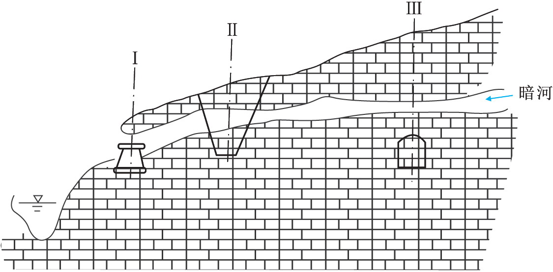 (1)線路標高低于暗河時,有三種可選方案,如圖4-3所示。Ⅰ方案線路在暗河下游,可將頂板揭開,設橋涵通過;Ⅱ方案以長路塹通過,挖方工程大,路基排水需特殊處理;Ⅲ方案以隧道通過,水文地質(zhì)條件不佳,頂板也要求有足夠厚度。實際工作時,可根據(jù)具體條件進行選擇。