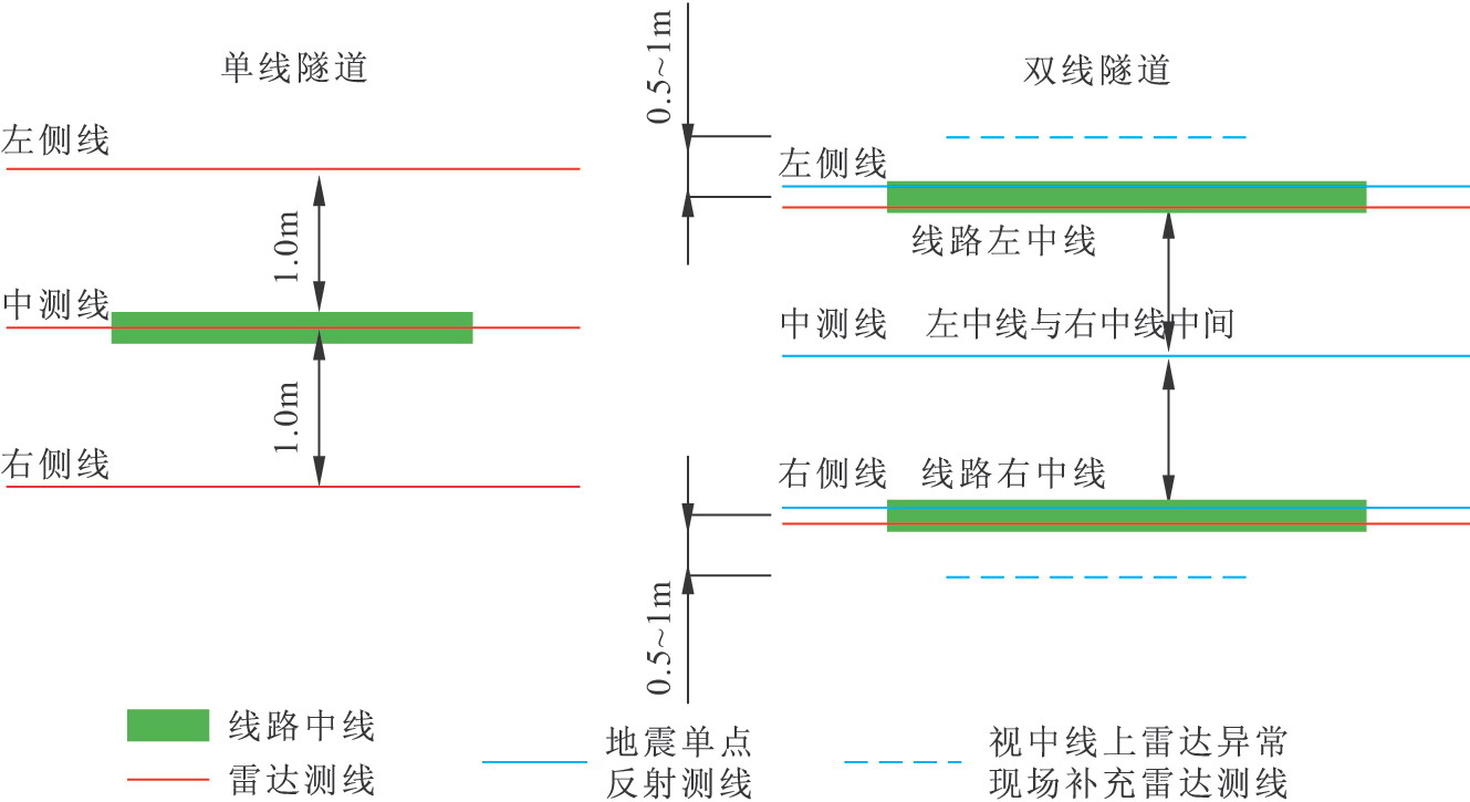 (1)單線隧道中線兩側(cè)1m地震單點反射測線各布置一條,中線上地質(zhì)雷達測線一條。