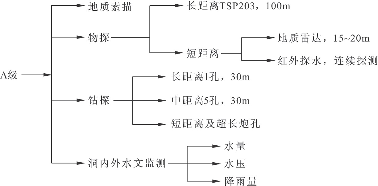 A級地段采用的方法組合為地質(zhì)素描、物探(長距離探測TSP203探測,短距離地質(zhì)雷達(dá)、紅外探水)、鉆探(長距離超前鉆孔1孔、中距離超前鉆孔5孔、短距離及超長炮孔)及水文監(jiān)測(水量、水壓、降雨量)相結(jié)合的模式來實(shí)現(xiàn)(圖6-38)。其中TSP探測兩次之間需搭接10m,超前鉆孔兩次之間需搭接5m,超長炮孔(按探測方案:正洞17孔,平導(dǎo)9孔)和地質(zhì)素描每施工循環(huán)(2~2.5m)一次。