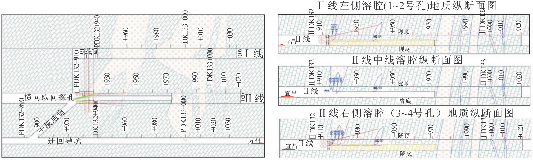 根據(jù)巖溶發(fā)育程度、涌(突)水量、斷層帶性質(zhì)、物探異常劃分隧道施工地質(zhì)超前探測(cè)分級(jí),A級(jí)地段1 058m,B級(jí)地段6 117m,C級(jí)地段1 600m。 DK132+990溶洞群位于DK132+700~DK133+200的A級(jí)地段中。