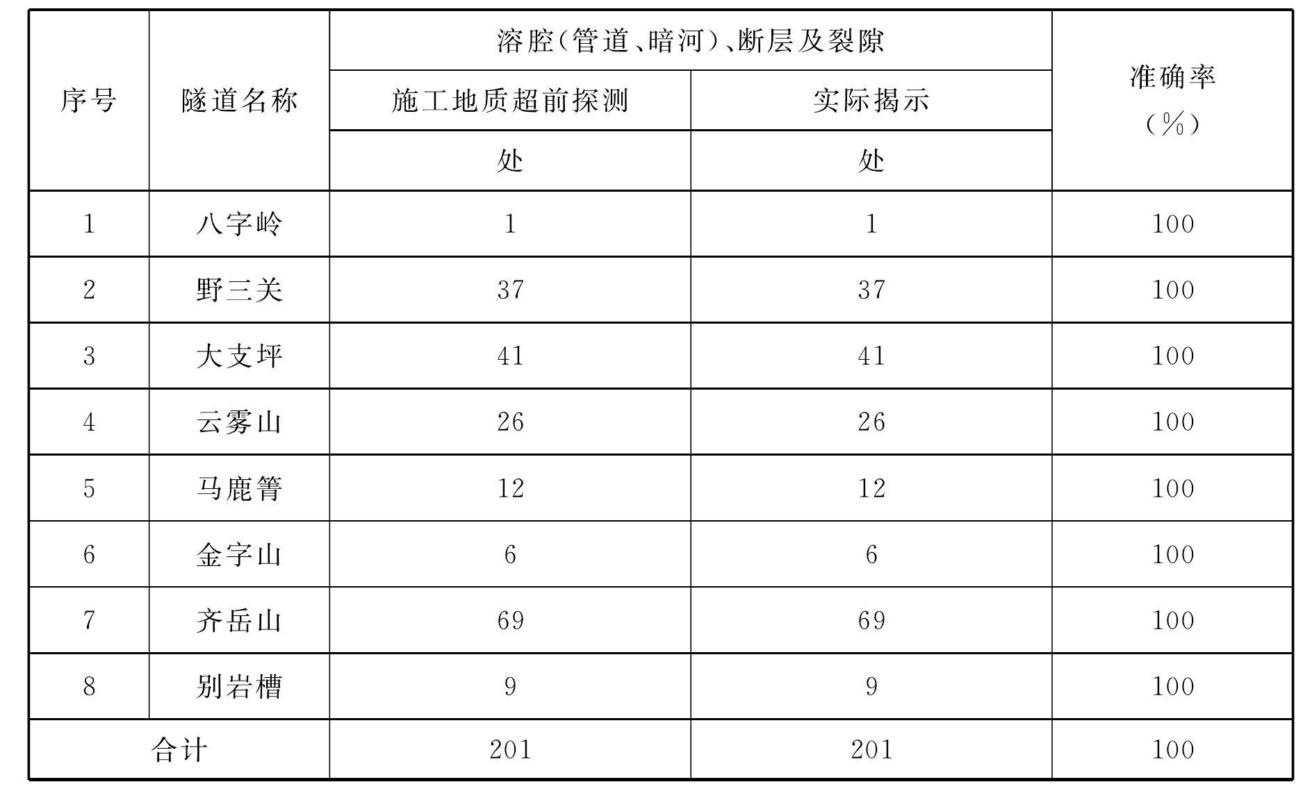宜萬(wàn)鐵路8座Ⅰ級(jí)風(fēng)險(xiǎn)隧道施工地質(zhì)超前探測(cè)出可能產(chǎn)生突水(泥)的風(fēng)險(xiǎn)源201處,其中,溶腔、管道、暗河及斷層72處,寬張裂隙129處,該結(jié)果與實(shí)際揭示結(jié)果完全一致,詳見表6-7。