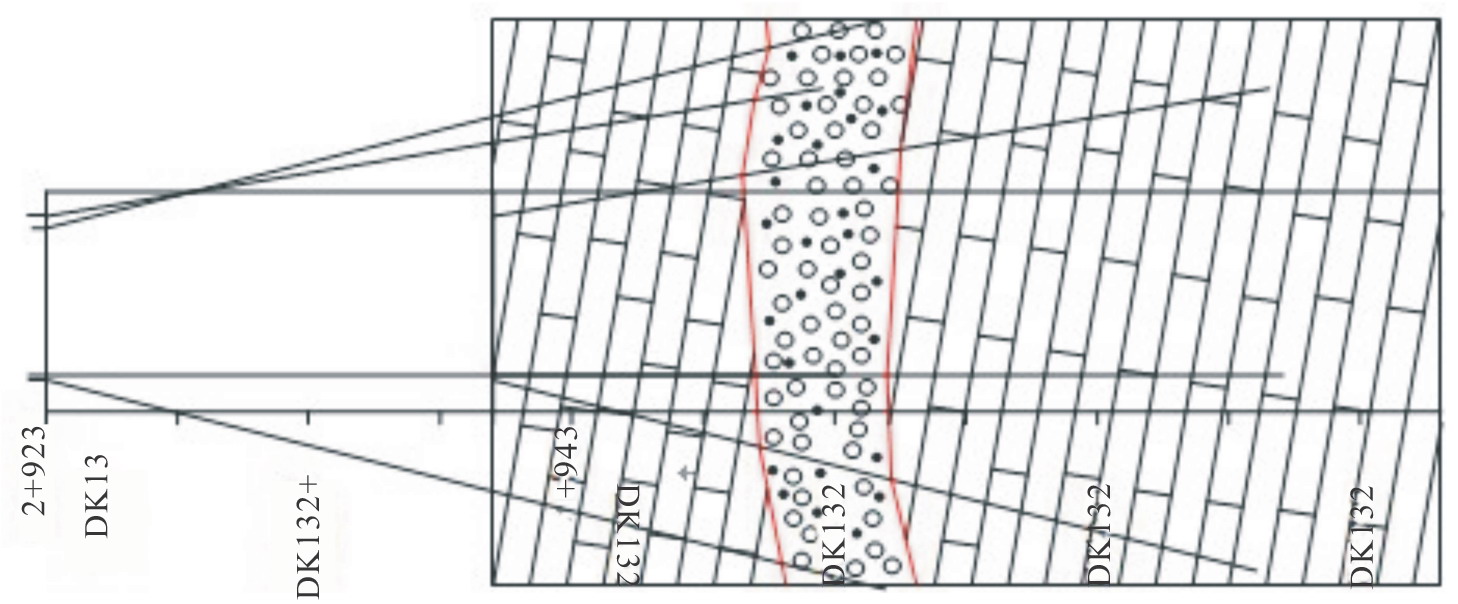 通過對(duì)I線、Ⅱ線、迂回導(dǎo)坑正反向6個(gè)掌子面超前探測(cè)及水文監(jiān)測(cè),得出:DK132+990溶洞群巖溶發(fā)育范圍為I線長(zhǎng)95m,Ⅱ線長(zhǎng)108m,迂回導(dǎo)坑在左邊墻有兩處巖溶裂隙;充填物為砂卵石及黏土;涌水量隨降雨變化,降雨后8~12h地下水明顯增大,停雨后24~48h地下水恢復(fù)正常,峰值涌水量為2.3萬(wàn)m3/h,水壓為0.3~0.8MPa。