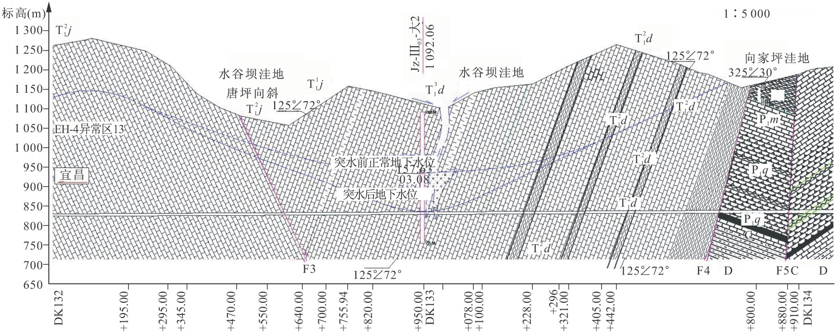 PDK132+990巖溶段發(fā)育地層為三疊系嘉陵江組下部和大冶組上部灰?guī)r,地表為水谷壩洼地,向斜構(gòu)造,其間發(fā)育有F3斷層。由于大冶組底部為泥巖和頁巖地層,為相對阻水層,有利于處于該阻水層上部的灰?guī)r地層巖溶和地下水發(fā)育。地下水流向由北東流向南西,排泄于野三河下游。地下水主要受大氣降水補給,地表深孔測得的地下水位埋深160m左右(標高943m),洼地匯水面積6.06 km2,見大支坪隧道區(qū)地下水流向圖(圖7-1)和PDK132+990巖溶段水文地質(zhì)縱斷面圖(圖7-2)。