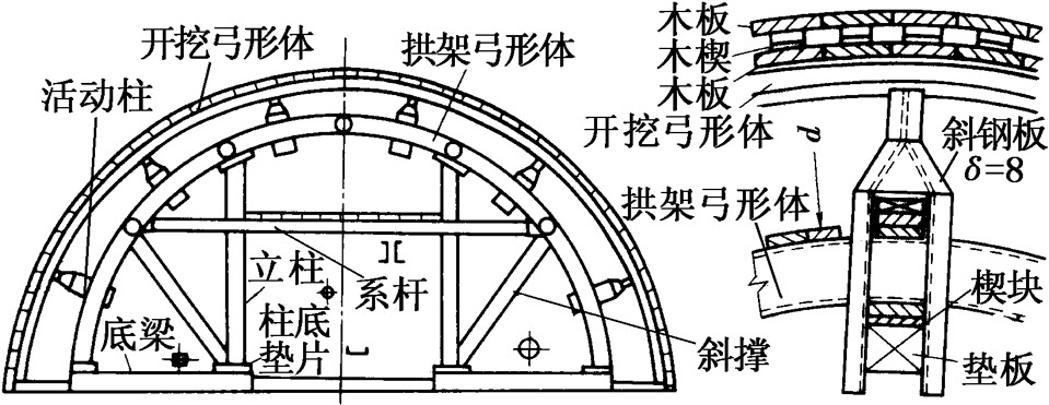 內(nèi)側(cè)用對(duì)稱設(shè)置的木柱支承,以減小弓形體斷面;中部設(shè)由兩根嵌入支柱的槽鋼組成的水平系桿加強(qiáng),可在其上鋪板后作腳手架;兩側(cè)底腳設(shè)有鋼靴。開(kāi)挖弓形體時(shí)作為地層支撐的支承構(gòu)件,用于架設(shè)與地層抵緊的插板。由底面朝上的小鋼軌彎成,可分幾段,用連接板連接;顒(dòng)柱由兩段槽鋼彎折而成,其間用兩根水平槽鋼焊接成一長(zhǎng)方形框架,頂部并合后焊成一體,端部留有支承開(kāi)挖弓形體小鋼軌頭部的槽口。類屬傳力構(gòu)件時(shí),用以將地層壓力經(jīng)由開(kāi)挖弓形體傳至拱架弓形體?裳毓凹芄误w移動(dòng),并可在任何一點(diǎn)固定。可借助墊板和木楔作一定限度的徑向伸縮,以適應(yīng)頂拱襯砌厚度的變化。數(shù)目可隨地質(zhì)條件的不同而增減。