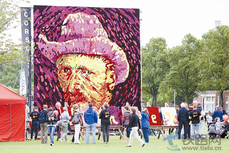 7月30日,參觀者在荷蘭阿姆斯特丹博物館廣場(chǎng)欣賞用鮮花組成的梵高畫像。