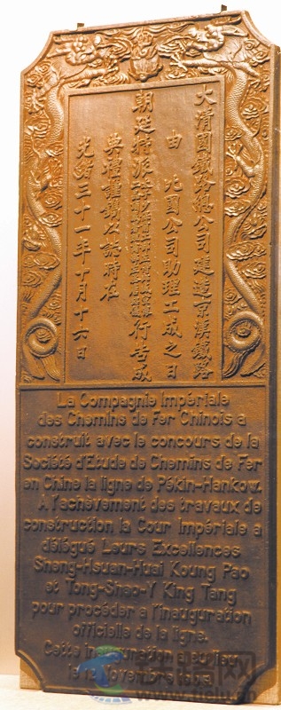 鐵碑高139厘米,寬59厘米,厚4厘米,鐵碑上用中文、法文兩種文字鐫刻,上半部兩邊兩條巨龍飛舞,中間中文為“大清國鐵路總公司建造京漢鐵路由比國公司助理工成之日朝廷特派太子少保前工部左侍郎盛宣懷二品頂戴署理商部左丞唐紹儀行告成典禮謹鐫以志時在光緒三十一年十月十六日”。下半部法文書寫的是同樣內(nèi)容。