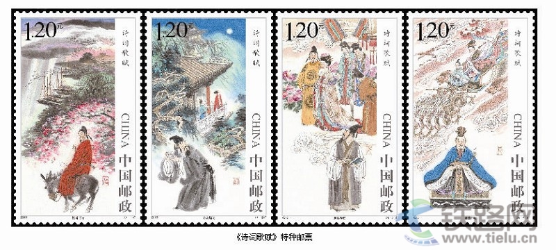 11月12日,中國郵政發(fā)行《詩詞歌賦》特種郵票,全套4枚。我國是詩詞歌賦的國度,歷代名家輩出,精品如林。4枚郵票內(nèi)容表現(xiàn)的是我國古代詩詞歌賦四種體裁的代表作者及其代表作品,圖案分別為“杜甫吟詩”“東坡填詞”“居易醉歌”和“曹植作賦”。郵票由我國著名畫家馮遠(yuǎn)先生創(chuàng)作設(shè)計(jì)。