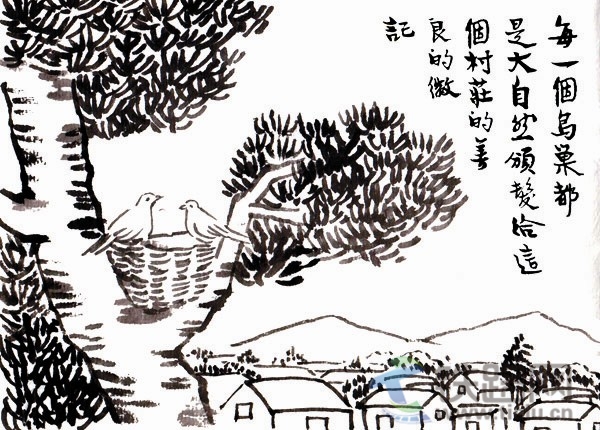 《與樹比肩》是一本極為可愛的書,這可愛體現(xiàn)在方方面面,比如書中的二十幅現(xiàn)代小插圖,畫風(fēng)古樸,筆法簡(jiǎn)潔,趣味生動(dòng),讀起來讓人禁不住微笑、點(diǎn)頭,嘆為賞之,慨而述之。每幅畫配合著文章,有簡(jiǎn)短的文字,言淺意深,意味深長(zhǎng)。如《風(fēng)骨與柔情》一文的插圖是一棵竹子和筍,文字是這樣的:“那雨很小,筍可借雨勢(shì)扶搖直上。”《秋日寫生帖》文章后面的插圖是一棵秋天的樹,文字是“把秋天的樹當(dāng)作花看”。