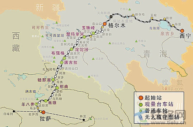 青藏鐵路全長1956公里,被譽(yù)為 “天路”。青藏鐵路實(shí)際上分兩期建成,一期工程東起青海西寧,西至格爾木,1958年分段開工建設(shè),1984年5月建成通車;青藏鐵路二期,也就是大多數(shù)人所指的青藏鐵路,東起青海格爾木,西至西藏拉薩,全長1142公里,2001年6月29日開工,2006年7月1日全線通車,途經(jīng)納赤臺、五道梁、沱沱河、雁石坪,翻越唐古拉山,再經(jīng)安多、那曲、當(dāng)雄、羊八井到拉薩。該段海拔4000米以上的路段為960公里,多年凍土地段為550公里。青藏鐵路是目前世界上海拔最高、凍土里程最長的高原鐵路。