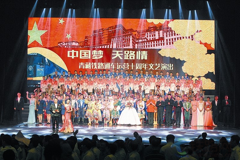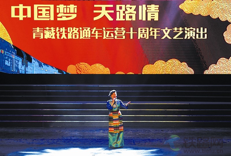 為慶祝青藏鐵路通車(chē)運(yùn)營(yíng)十周年,由中國(guó)鐵路總公司舉辦、中國(guó)鐵路文工團(tuán)主創(chuàng)和演出的 “中國(guó)夢(mèng)天路情”青藏鐵路通車(chē)運(yùn)營(yíng)十周年文藝演出在北京展覽館劇場(chǎng)上演。