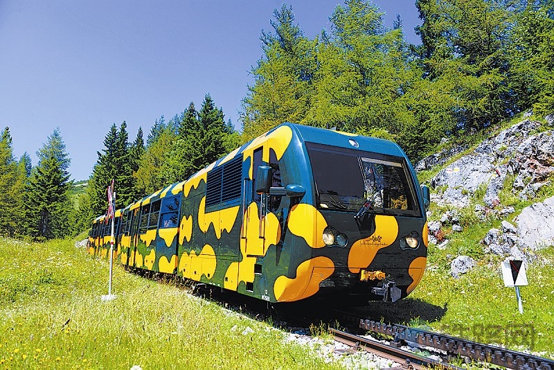 如果說登山鐵路也要找一個(gè)吉祥物,大家會選擇誰呢?奧地利施內(nèi)山登山鐵路另辟蹊徑,把蠑螈作為自己的代言人,不僅把蠑螈畫像搬上了車頭,車身也涂裝得色彩斑斕。穿行山間,活脫靈巧的 “蠑螈”吸附在巖壁上攀爬而行,成為遠(yuǎn)近聞名的明星。