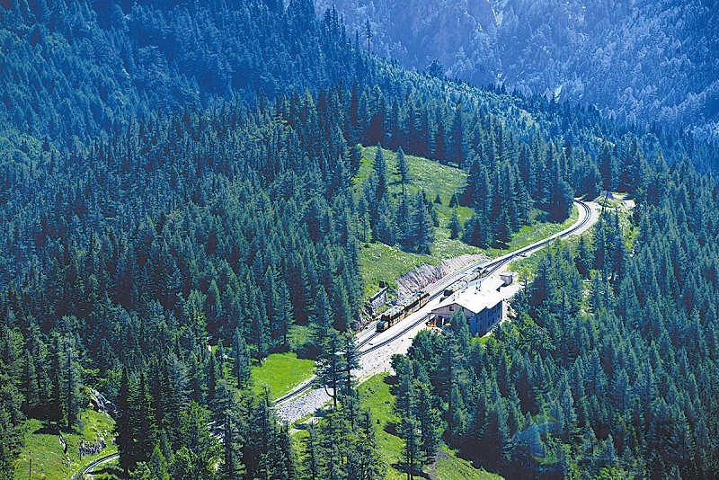 圖一:在山腳下的密林中穿行的登山列車