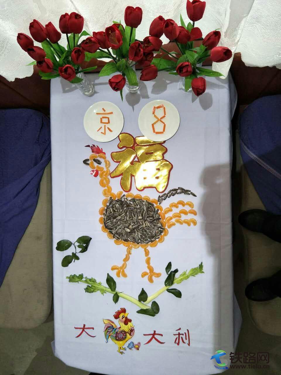 晚上8點左右,等旅客們基本用完餐,張鳳生又開始忙了,在后臺里忙著切菜、炒菜……就只為給乘務員們準備一桌豐盛的年夜飯。瞧那,一盤盤秀色可餐的擺盤,一道道精美絕倫的菜品,就這樣呈現(xiàn)在了我們的面前。大家的氣氛也熱鬧起來了,大家邊吃邊聊,說說笑笑,聊聊家庭,聊聊新年愿望,其樂融融。還有乘務員們自編自導的小節(jié)目。忙活了半天的張鳳生從后臺出來,一同與大家吃著自己做的的“年夜飯”。